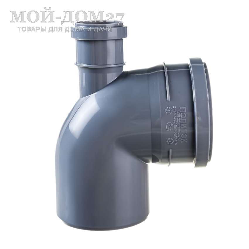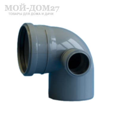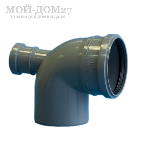 Отвод 110 мм с углом поворота 87 градусов и выходом 50 мм, используется для создания отводов и изгибов, а также подключения дополнительных элементов и сантехнических устройств канализационных коммуникаций.