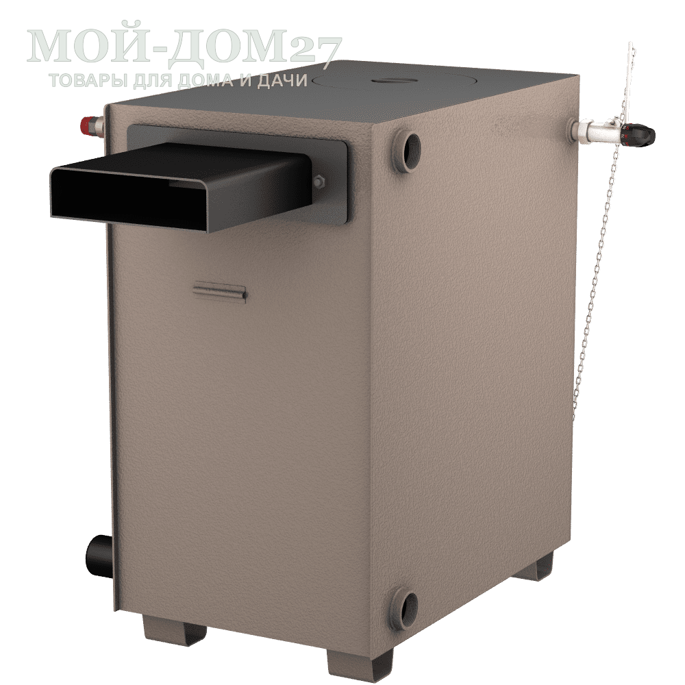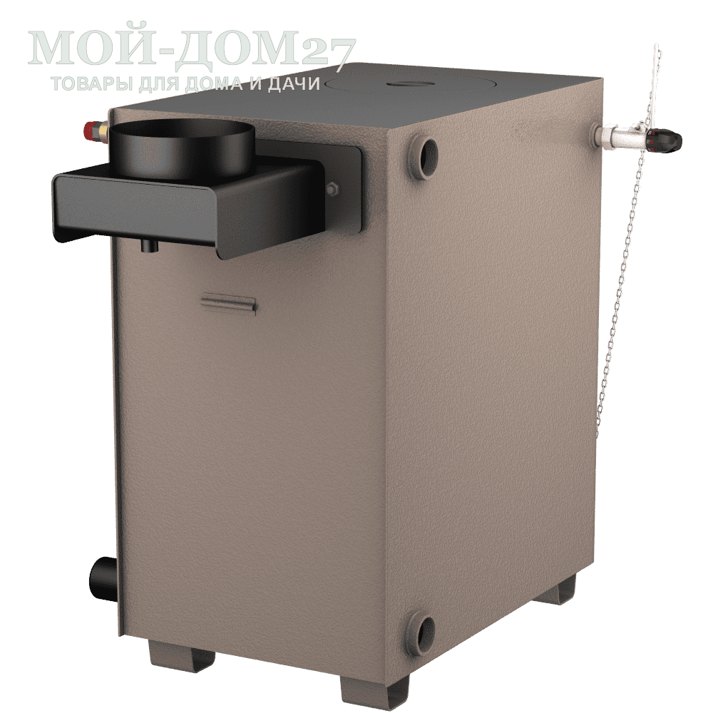 Толщина металла стального корпуса 3 мм с вместительной водяной рубашкой 80 литров по бокам и снизу котла. Что увеличивает КПД и скорость прогрева системы.