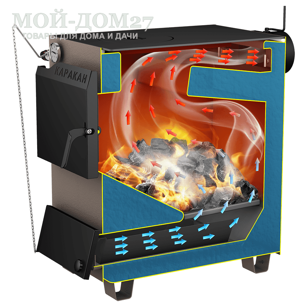 Для улучшения теплообмена в конструкции твердотопливного котла КАРАКАН добавлена навесной водонаполненный козырек, который отделяет газоход от камеры сжигания.