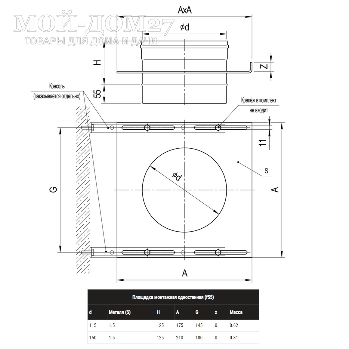 Используется при монтаже одностенного дымохода, совместно с консолью в качестве опоры дымохода. Площадка монтажная способна выдерживать большие нагрузки. При монтаже дымохода с применением конструкции Консоль + Монтажная площадка, такую опору необходимо устанавливать на вертикальных участках через каждые 3-4 метра сэндвичей, а также в местах, где необходимо усилить крепление конструкции (после поворотов дымоходной системы тройниками, коленами).