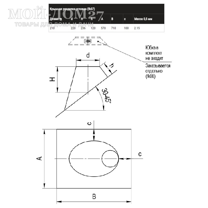 Предназначена для прохода дымохода через крышу здания. Угловая крышная разделка применяется для крыш с уклоном 45°. Допускается небольшое отклонение от данного параметра, как в большую и в меньшую сторону.