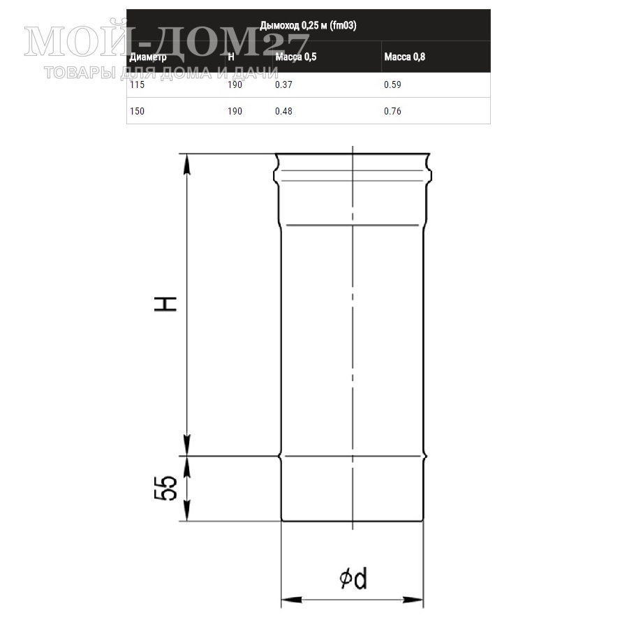 Является основным элементом дымоходной системы. Дымоход 0,25м D-150 предназначен для отведения продуктов сгорания на прямых участках. Дымоход 0,25м D-150 применяется как вставка между элементами (например, между двумя элементами Колено угол 135° D-150 для увеличения расстояния смещения данных элементов). Данный элемент применяется для "добора" длины одностенного прямолинейного участка дымохода при подключении его к теплогенерирующему прибору (банной печи, отопительной печи, камину, газовой колонки). Дымоход 0,25м D-150 часто устанавливается первой трубой, отходящей от теплогенерирующего прибора (банной печи, отопительной печи, камину, газовой колонки) вверх или в сторону, после чего следует отвод дымохода в сторону стены (потолка) или устанавливается переход на утепленную трубу.