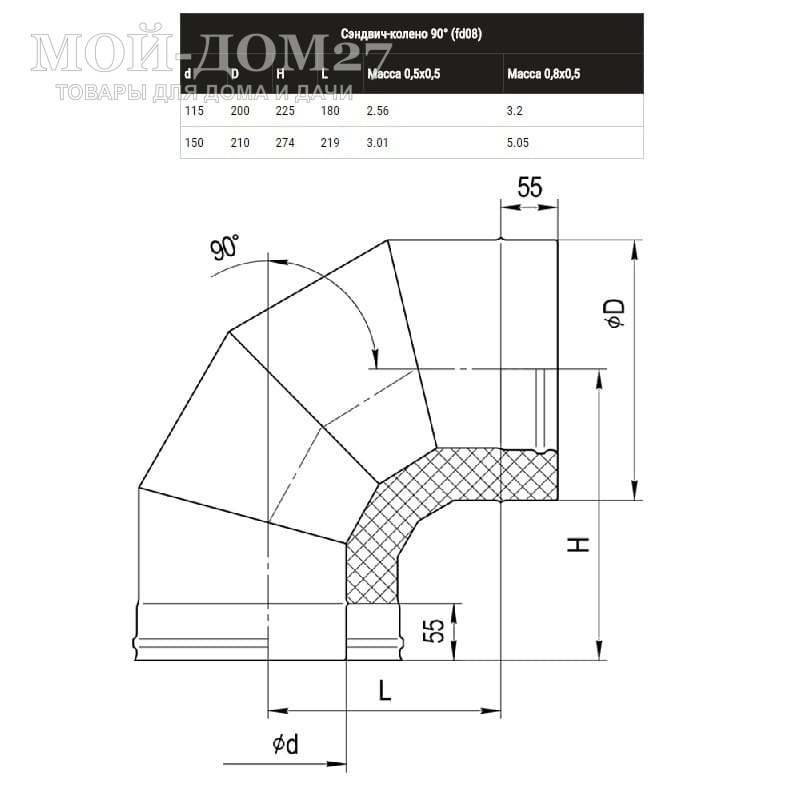 При подборе дымохода для банной печи на данном элементе не следует экономить. Не рекомендуется выбирать более тонкостенное Сэндвич-колено 90° D-150х210 на начальных участках дымохода, где наблюдается самая высокая температура выхлопных газов. Если сэндвич-колено проходит внутри жилого помещения, то необходимо чтобы оно имело нержавеющую оболочку, сэндвич-колено с оцинкованной оболочкой не рекомендуется устанавливать в жилых помещениях.