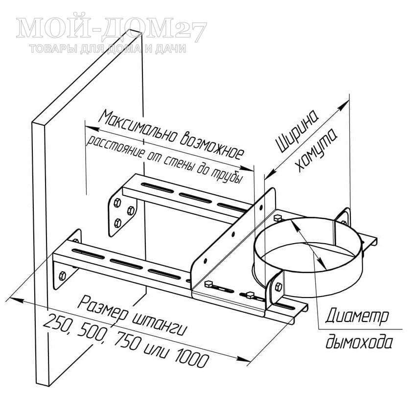 Штанга для стенового хомута (AISI 430) L 250 может использоваться как горизонтально, так и вертикально. Штанга для стенового хомута (AISI 430) L 250 применяется совместно со стеновым хомутом для обеспечения наибольшего расстояния между стеной и дымоходом. В комплекте 2 штанги - левая и правая и набор крепежных элементов (болты, шайбы, гайки).