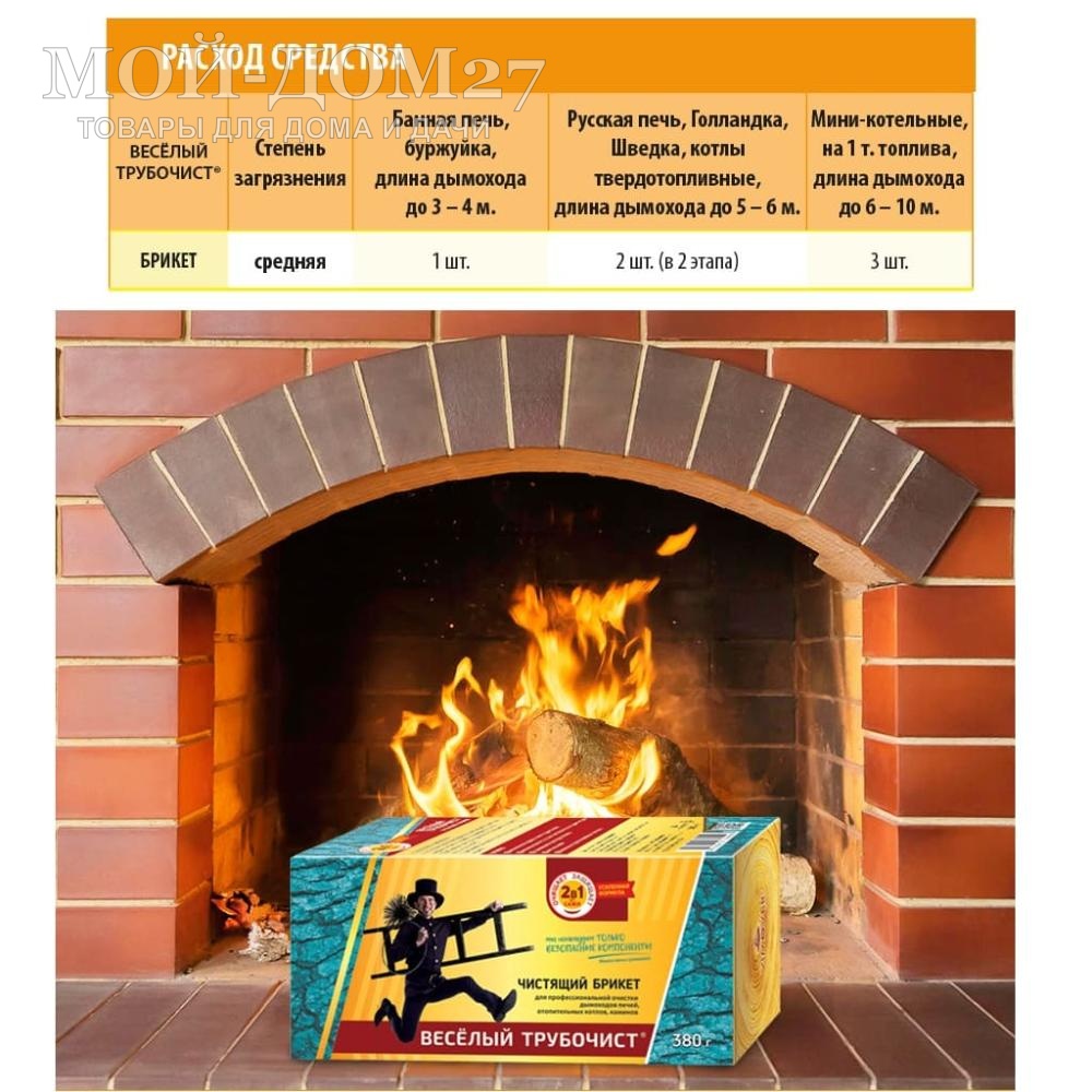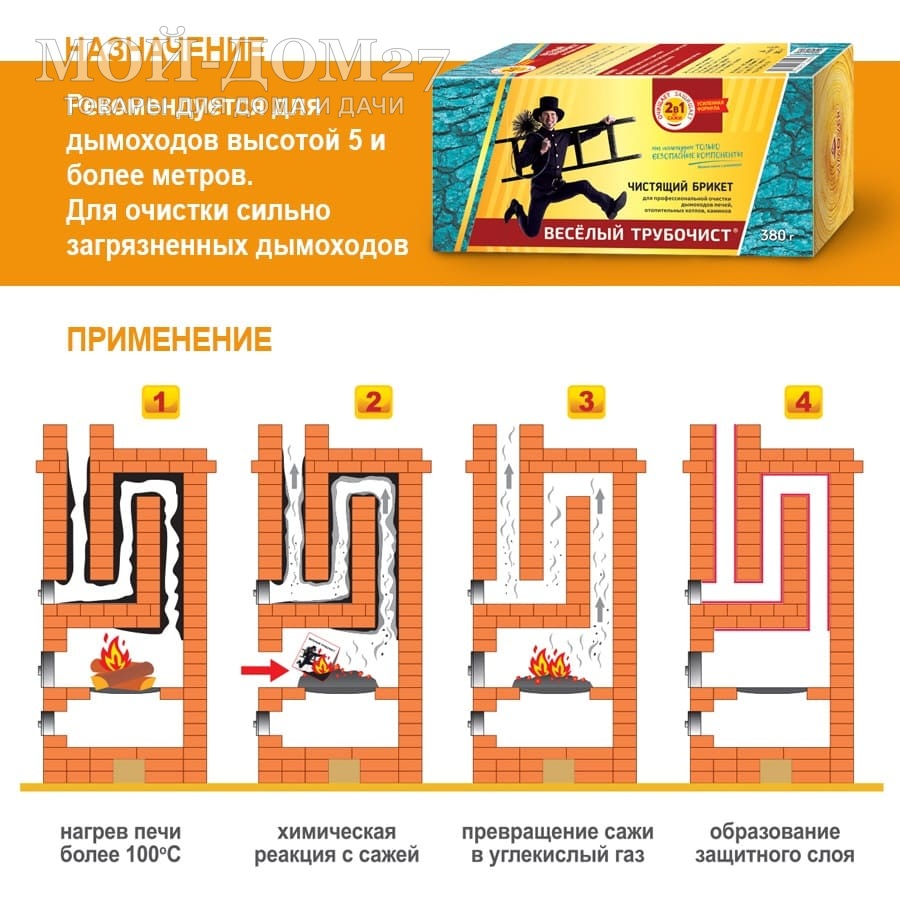 Способ применения: положить брикет на раскаленные угли прогретой печи или котла. Наилучший результат чистки достигается в ясную, ветреную погоду.