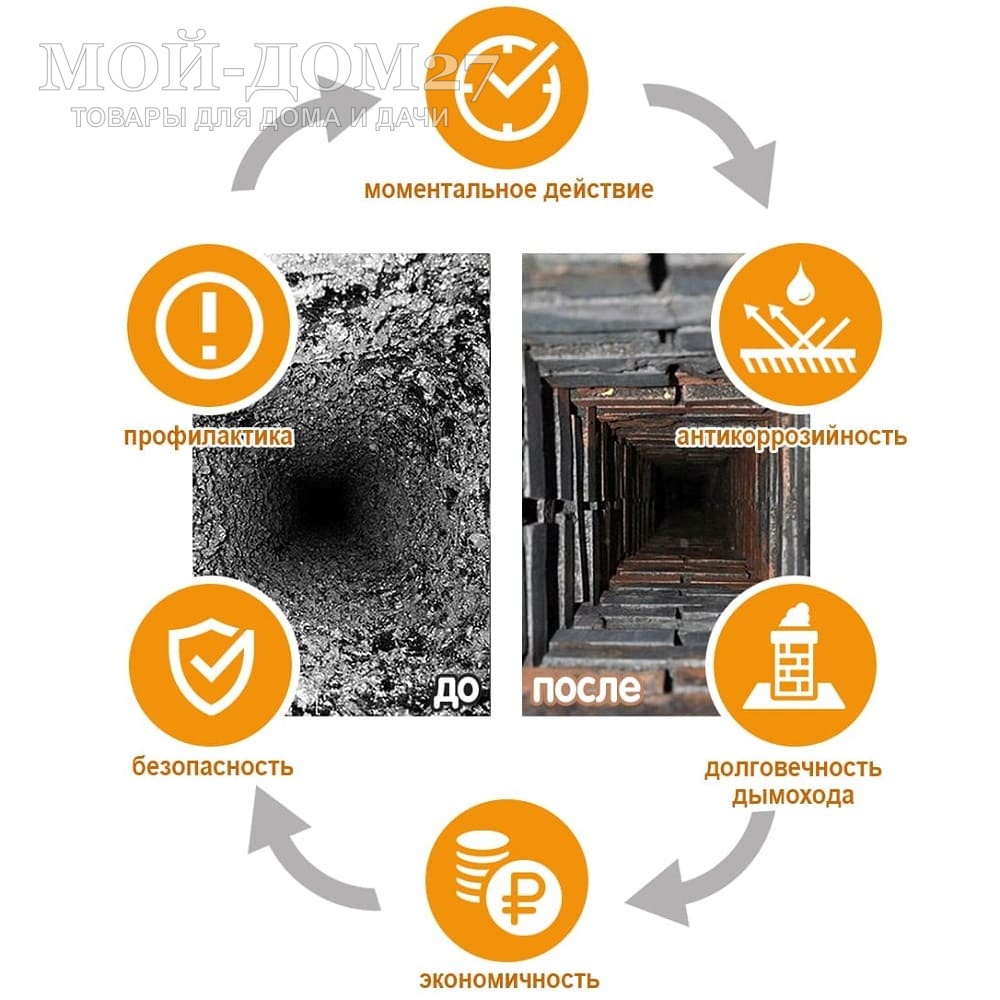 Назначение: применяется для очистки и защиты дымоходов от сажи и копоти. Применим для прямых дымоходов (каминные и банные печи), дымоходов сложной конструкции (дымоходы русских печей), для твердотопливных (дровяных, угольных, брикетных) котлов с температурой горения от 180 градусов.