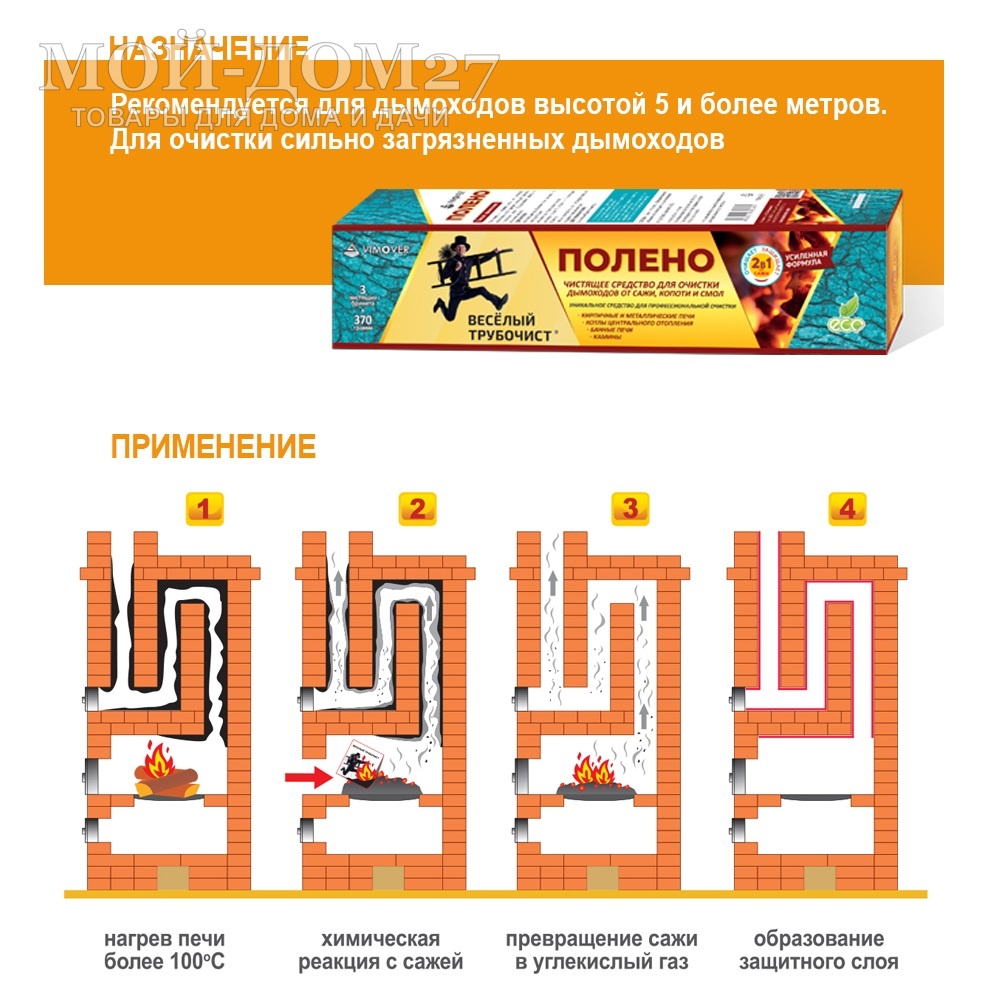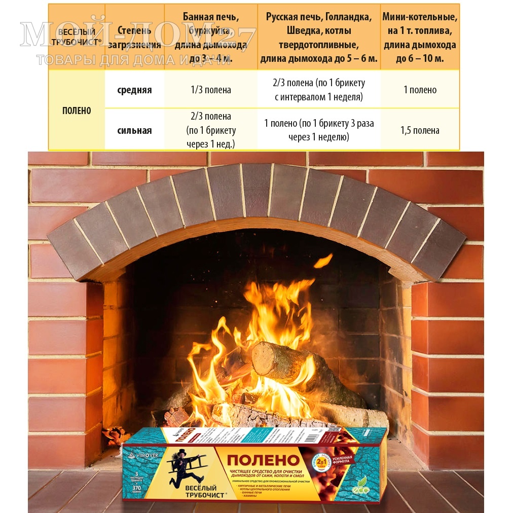 Способ применения: положить брикет на раскаленные угли прогретой печи или котла. Наилучший результат чистки достигается в ясную, ветреную погоду.