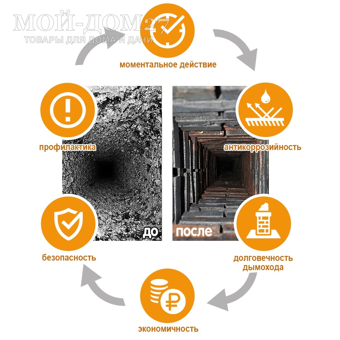 Принцип действия: в процессе горения брикета выделяются частички катализатора, которые взаимодействуют с углеродом (сажа, копоть, креозот) разрыхляют его (происходит окисление углерода) и преобразуют в углекислый газ. При этом катализатор предотвращает проникновение угарного газа в помещение. Продукты горения выходят из трубы с потоком раскаленного воздуха, а не осыпаются вниз. При использовании средство не имеет запаха, нет необходимости проветривать помещение или закрывать топку.
