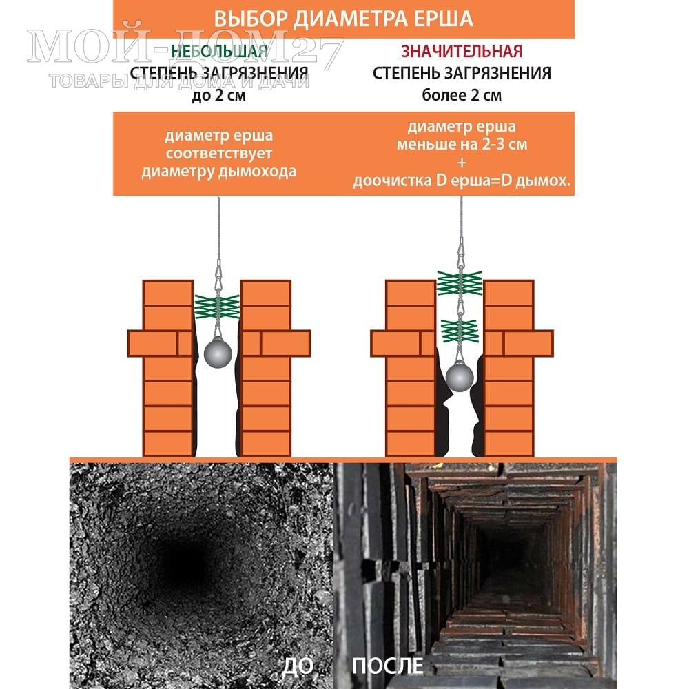 Применим только для прямых дымоходов. Набор снабжён всем необходимым для качественной прочистки дымоходов. В комплект входит ёрш с упругими износостойкими щетинками из полипропилена высокой плотности. Ёрш подбирается в соответствии с диаметром дымохода. Если засор крупный, вначале необходимо прочистить дымоход при помощи груза, затем прикрепить щётку и убрать оставшиеся наслоения сажи. Следите за тем, чтобы при чистке сажа не попала внутрь помещения, для чего завесьте люки печи, к примеру, влажной тканью. После использования щетина легко чистится от сажи и грязи.