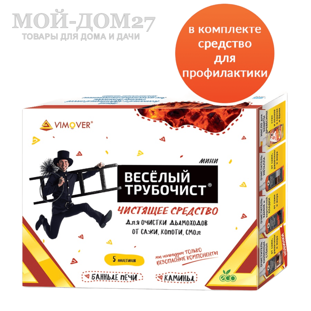 Предотвращает возгорание сажи в дымоходах. Прост в использовании и сборке. Универсален: применим для различных диаметров дымохода. Подходит для металлических и кирпичных дымоходов. Снабжен перчатками и маской.
