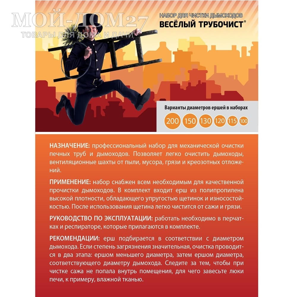 Применим только для прямых дымоходов. Набор снабжён всем необходимым для качественной прочистки дымоходов. В комплект входит ёрш с упругими износостойкими щетинками из полипропилена высокой плотности. Ёрш подбирается в соответствии с диаметром дымохода. Если засор крупный, вначале необходимо прочистить дымоход при помощи груза, затем прикрепить щётку и убрать оставшиеся наслоения сажи. Следите за тем, чтобы при чистке сажа не попала внутрь помещения, для чего завесьте люки печи, к примеру, влажной тканью. После использования щетина легко чистится от сажи и грязи.