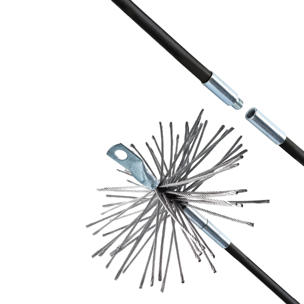 Сочетается с комплектом гибких стержней из упругого пластика, которые позволяют без труда пройти дымоход сложной конфигурации, имеющий изгибы и даже прямые углы.