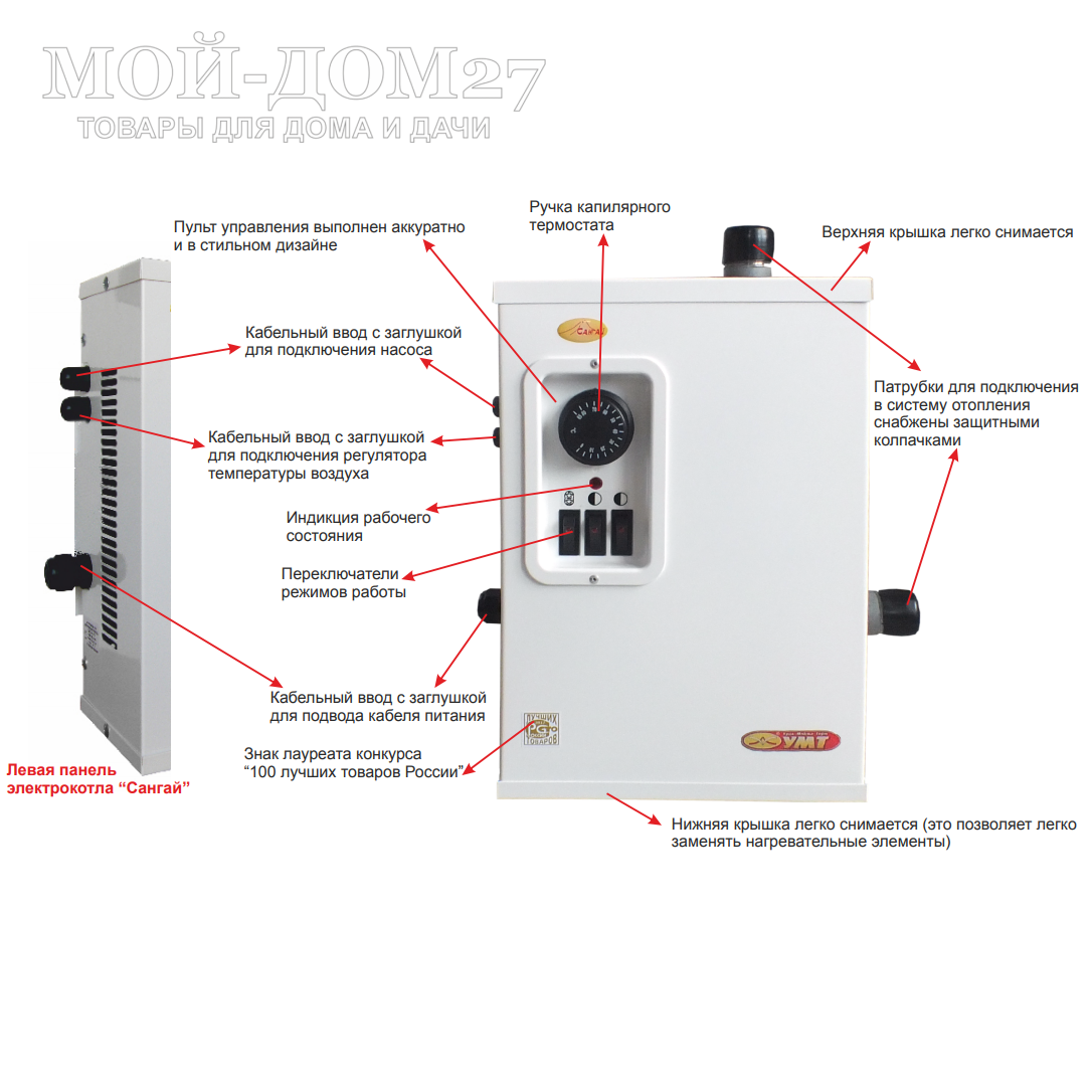 Электрический котел ЭВПМ-3 «Сангай» — достаточно простое устройство. Основными его элементами котла являются: теплообменник, состоящий из бака с укрепленными в нем электронагревателями (ТЭНами), а также блок управления и регулирования. Главным достоинством электрических котлов являются возможность автоматизации работы электрокотла и простота поддержания заданной температуры в помещении.