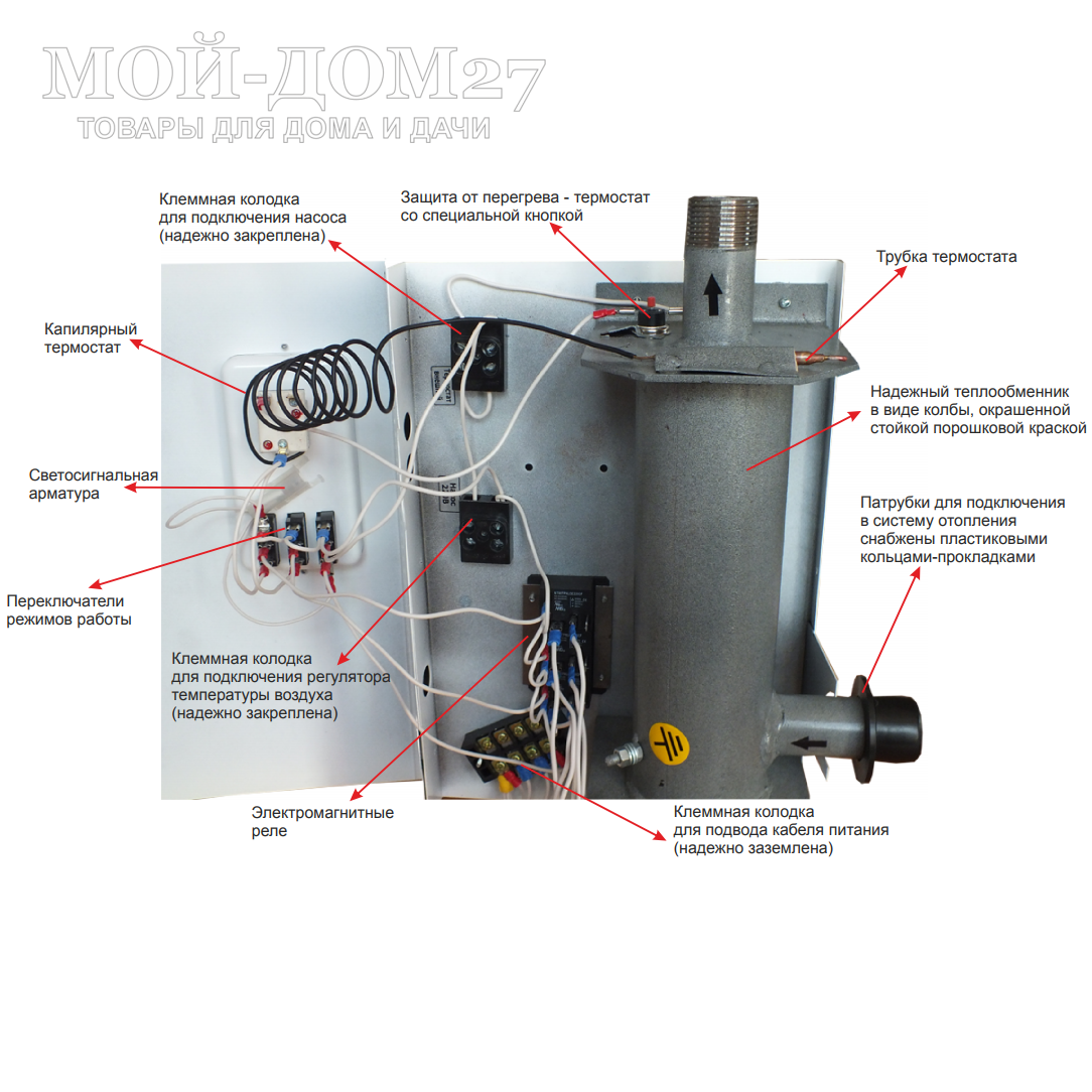 - Наличие вводного и контактного устройства для подключения циркуляционного насоса и выносного регулятора температуры воздуха в помещении