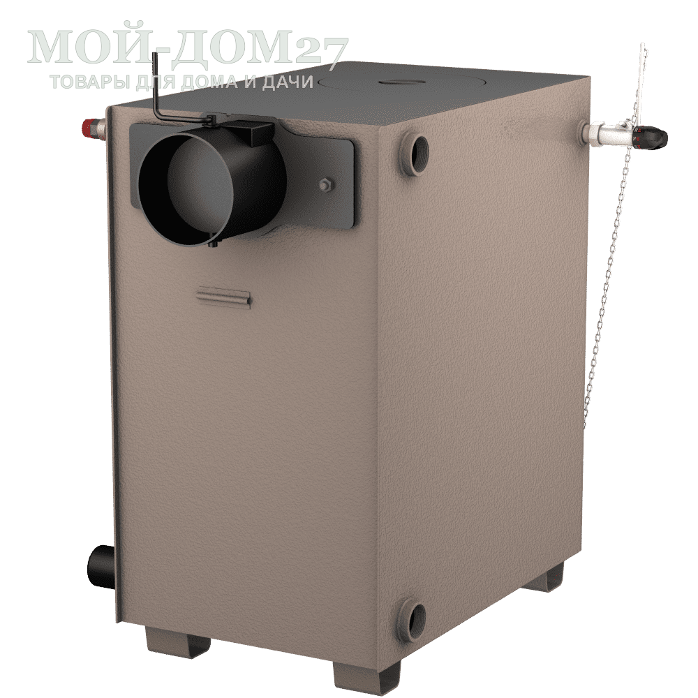 Толщина металла стального корпуса 3 мм с вместительной водяной рубашкой 80 литров по бокам и снизу котла. Что увеличивает КПД и скорость прогрева системы.
