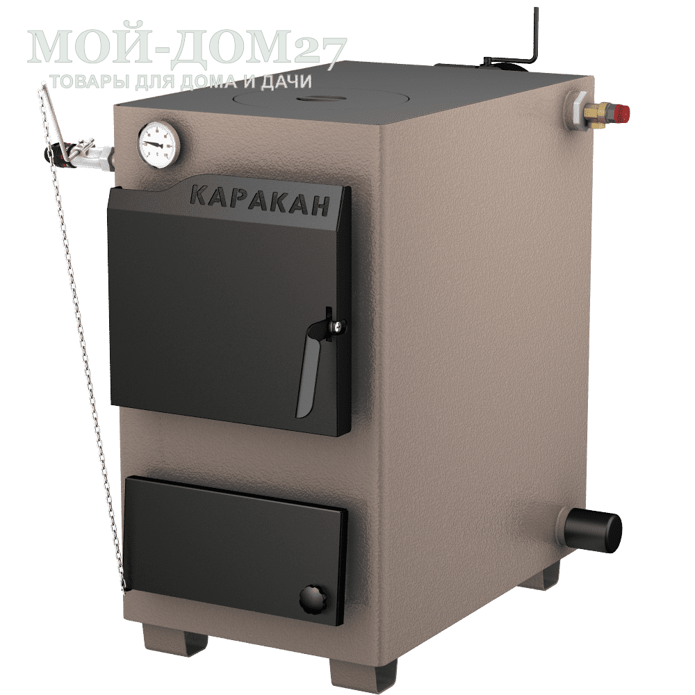 Комбинированный котел КАРАКАН на каменном, буром угле, дровах, древесных брикетах и электричестве получил большое распространение для отопления частного дома (для водяного отопления зданий различного назначения, оборудованных системой отопления с естественной или принудительной циркуляцией) благодаря низкой стоимости и простоте в монтаже.