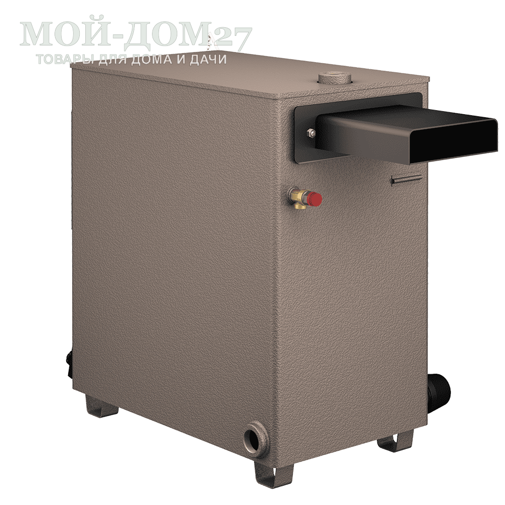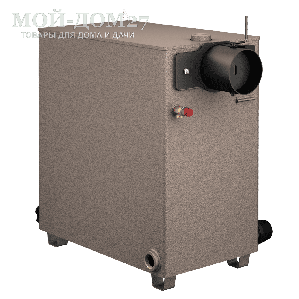 Толщина металла стального корпуса 3 мм с вместительной водяной рубашкой 85 литров по бокам и снизу котла. Что увеличивает КПД и скорость прогрева системы.