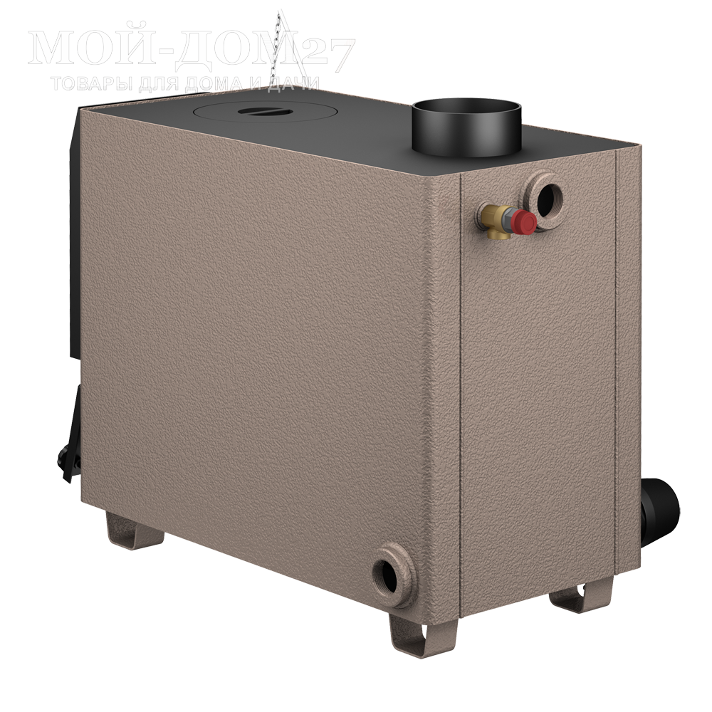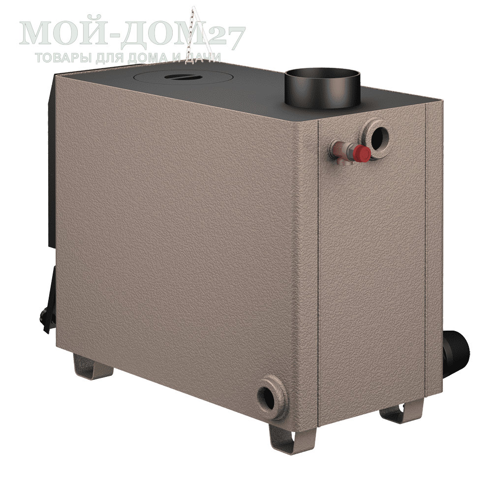 Толщина металла стального корпуса 3 мм с вместительной водяной рубашкой 42 литра по бокам и снизу котла. Что увеличивает КПД и скорость прогрева системы.