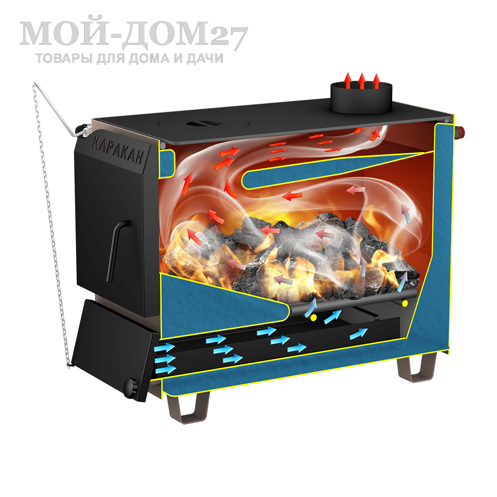 Для улучшения теплообмена в конструкции твердотопливного котла КАРАКАН добавлена навесной водонаполненный козырек, который отделяет газоход от камеры сжигания.