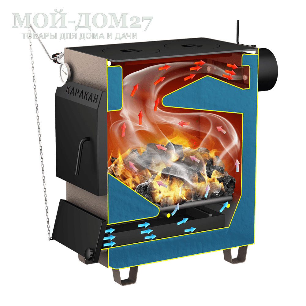 Для улучшения теплообмена в конструкции твердотопливного котла КАРАКАН добавлена навесной водонаполненный козырек, который отделяет газоход от камеры сжигания.