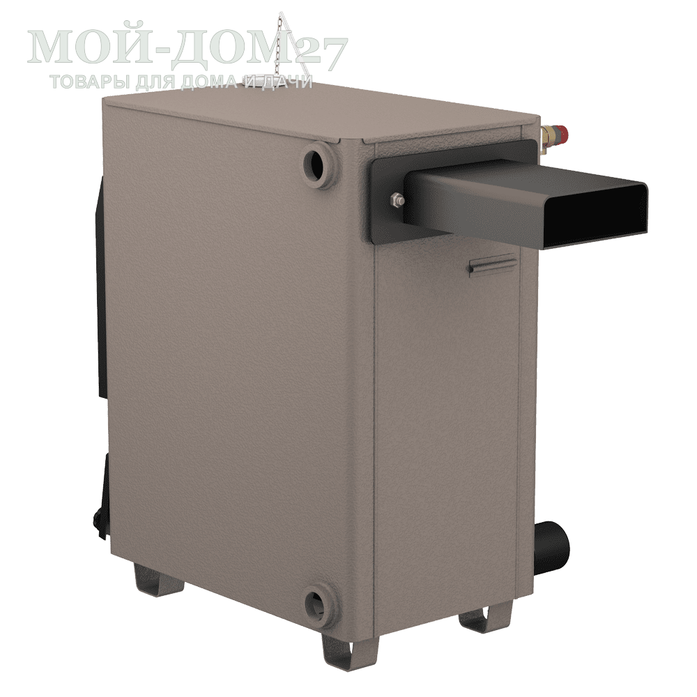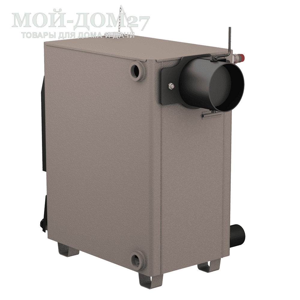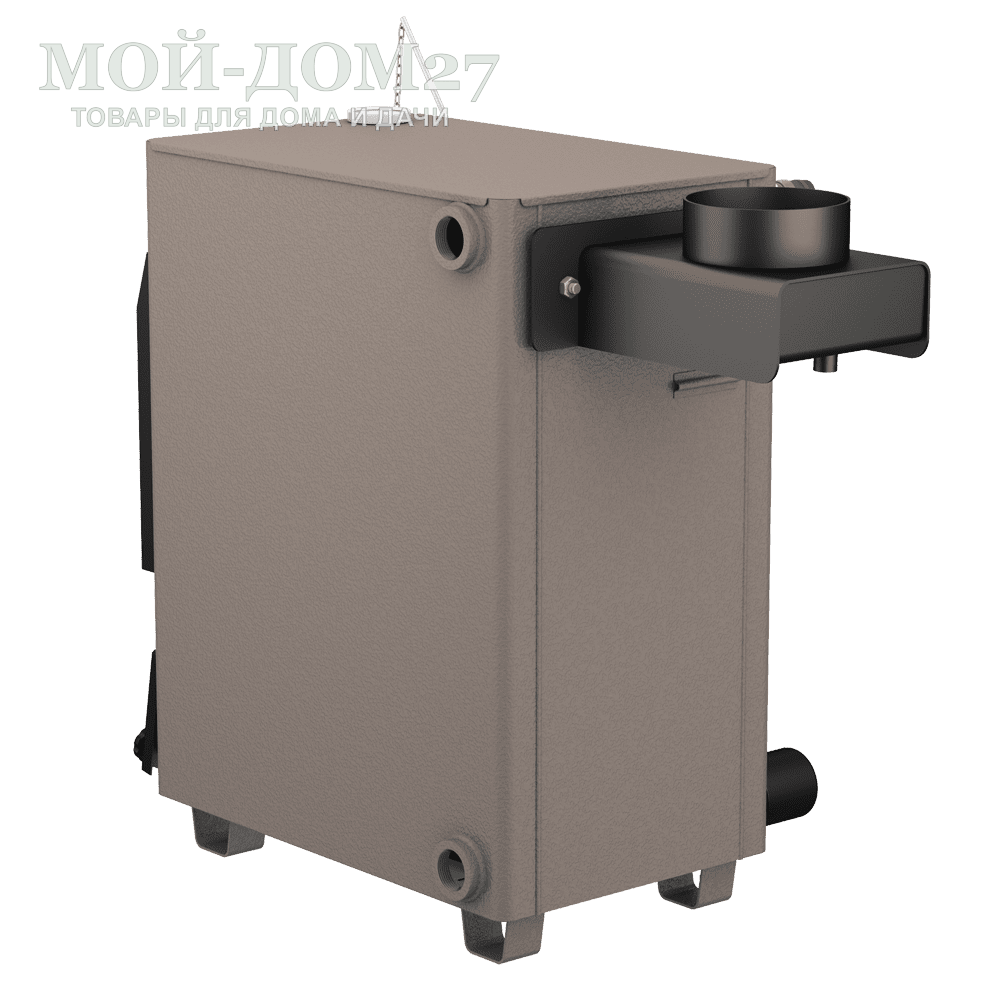 Толщина металла стального корпуса 3 мм с вместительной водяной рубашкой 50 литров по бокам и снизу котла. Что увеличивает КПД и скорость прогрева системы.