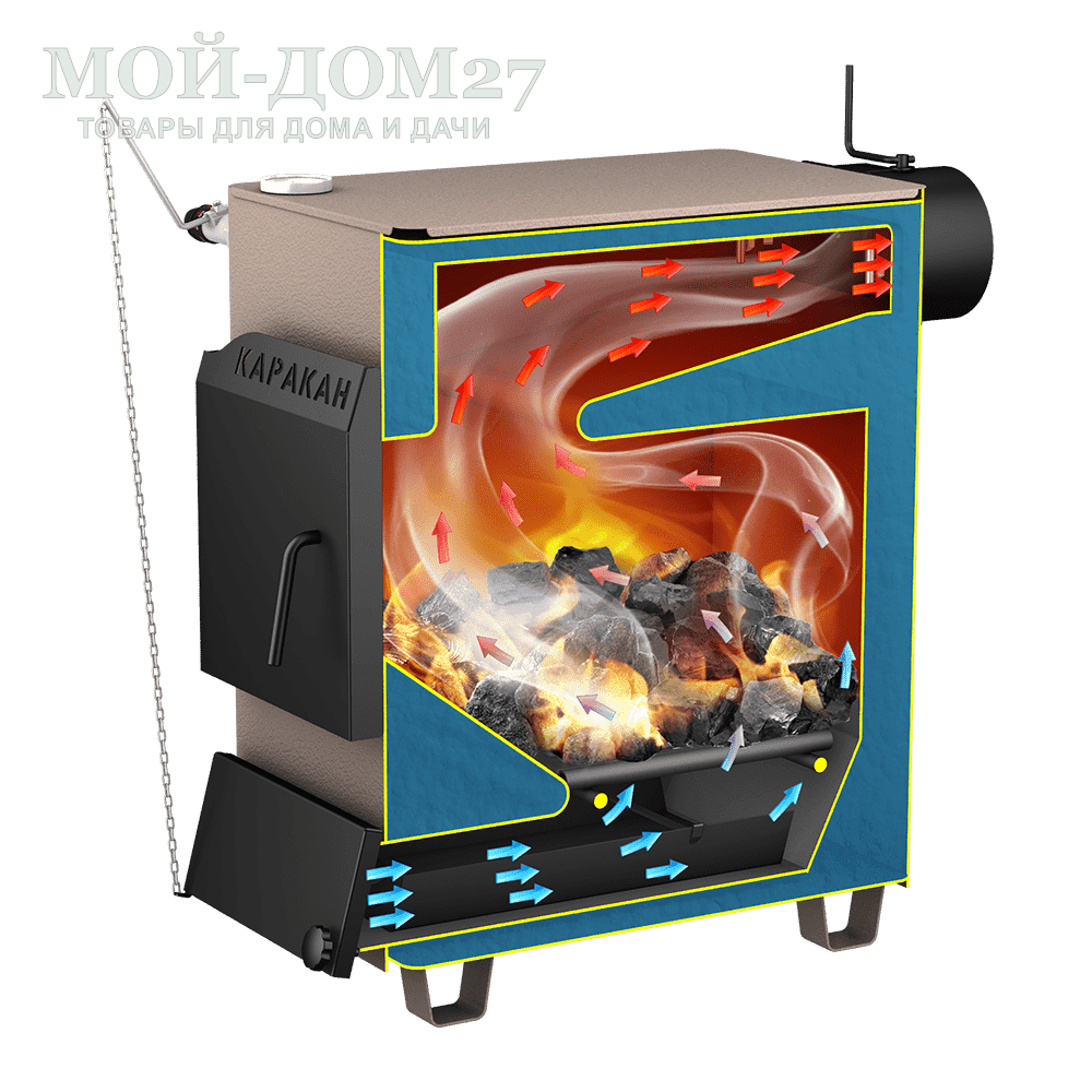 Для улучшения теплообмена в конструкции твердотопливного котла КАРАКАН добавлена навесной водонаполненный козырек, который отделяет газоход от камеры сжигания.