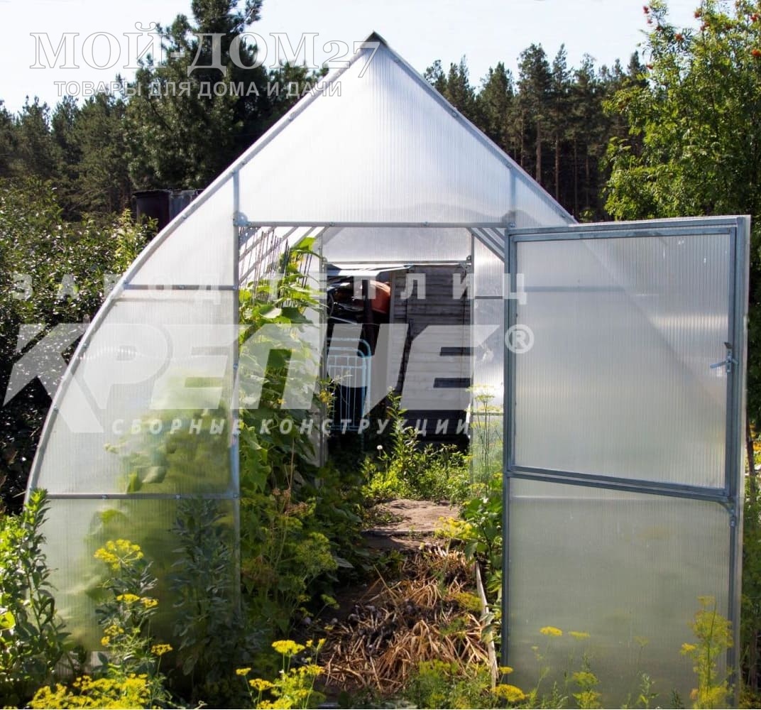 В каждом торце теплицы есть дверь и форточка для проветривания (две двери и две форточки). Ширина двери – 960 мм. Размер форточки в дверях: 915х840 ммВ комплект входит сотовый поликарбонат, разработанный специально для теплиц.