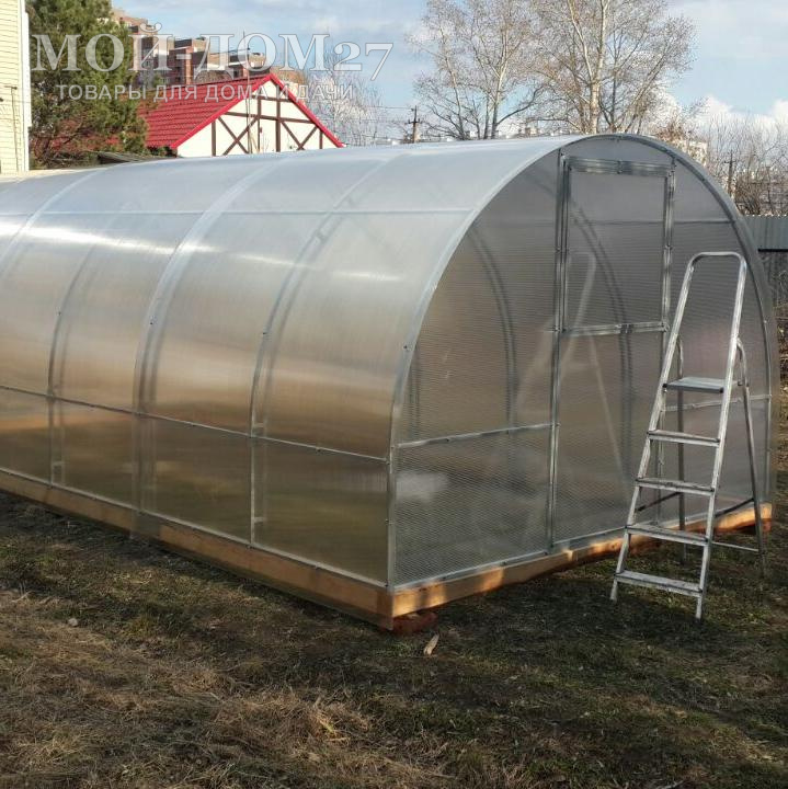 Длина - 6 метров, устанавливается с отступом от наружного края фундамента на расстояние равное длине козырька поликарбоната, укладываемого по дуге над торцом. Для того чтобы была возможность закрепить нижний край козырька поликарбоната к фундаменту, чтобы обеспечить жесткость данного козырька