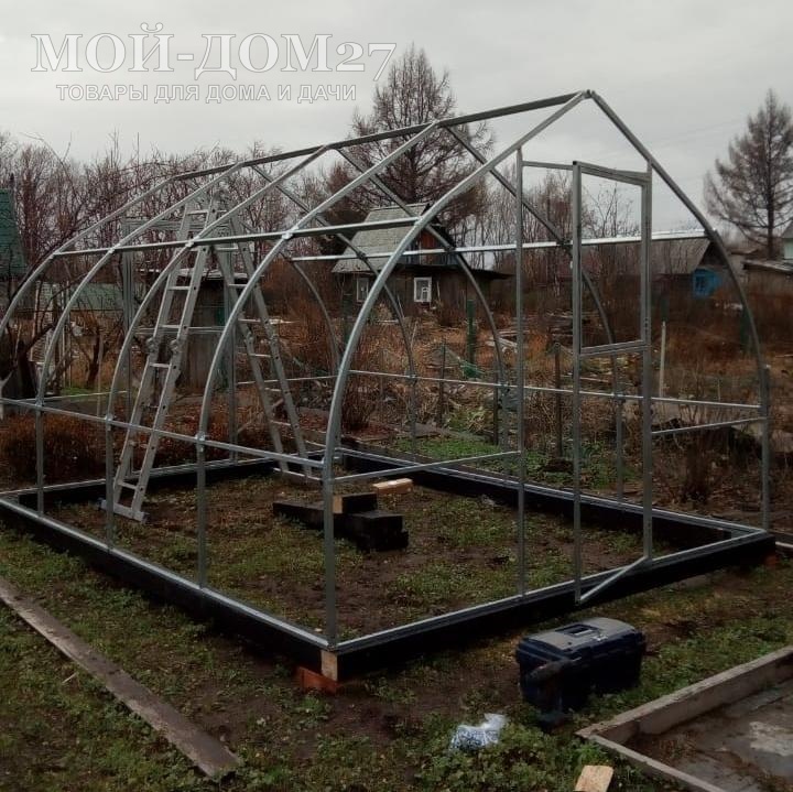 Монтаж (установка) на фундамент (землю) – по всему периметру основания теплицы идет оцинкованная труба, через которую происходит крепление теплицы к фундаменту (основанию).