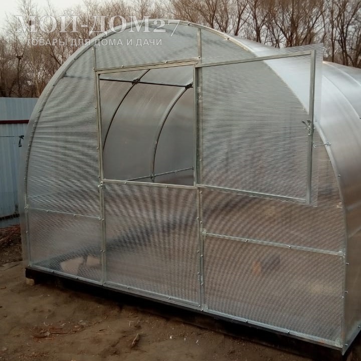 В каждом торце теплицы есть дверь и форточка для проветривания (две двери и две форточки). Ширина двери – 960 мм. Размер форточки в дверях: 915х840 мм