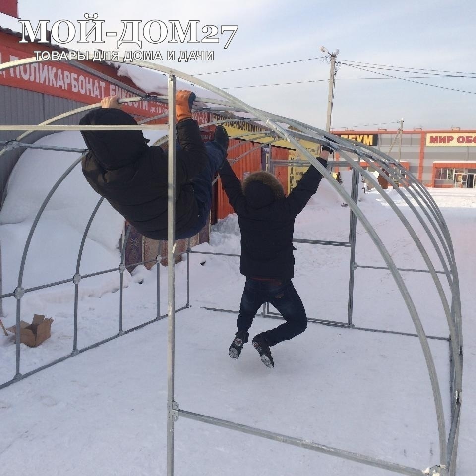 Теплица Восточная Усиленная благодаря увеличенному количеству дуг (расстояние между дугами 0,65 метра) с толщиной 1,2 мм и за счет надежной сборки системой краб, позволяет выдерживать значительные снеговые нагрузки до 150 кг/м2 и ветровые нагрузки до 20 м/с.Помимо этого, теплица укомплектована ручками с возможностью закрывать дверь и форточки как снаружи так и изнутри теплицы.