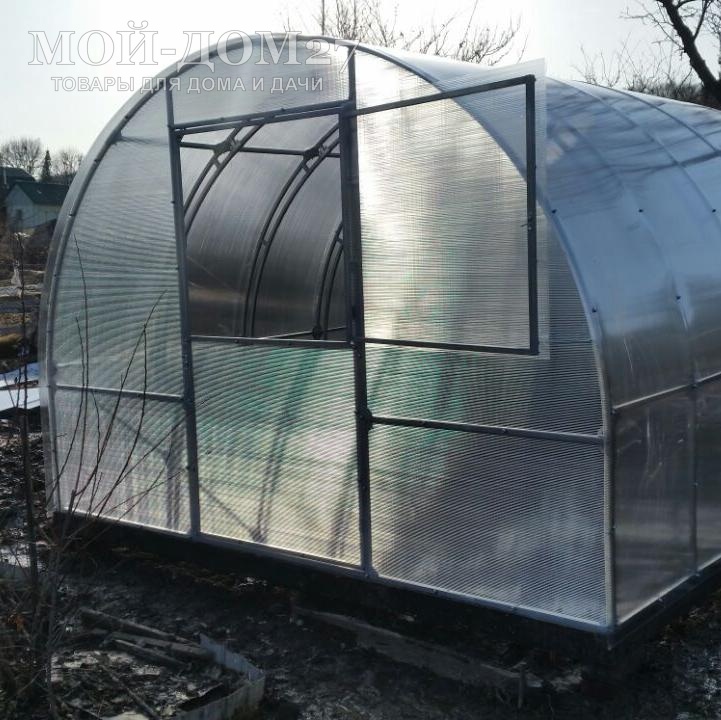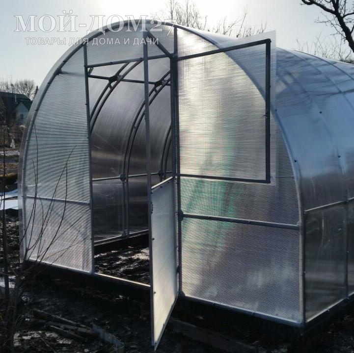 В каждом торце теплицы есть дверь и форточка для проветривания (две двери и две форточки). Ширина двери – 960 мм. Размер форточки в дверях: 915х840 мм