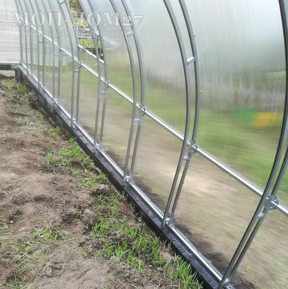 - Ширина – 3,01 метра. Устанавливается по наружному краю фундамента, для того чтобы поликарбонат, монтируемый по дуге теплицы не подрезался и заходил с нахлестом на фундамент. Благодаря чему удастся избежать щели между фундаментом и поликарбонатом, т.к. поликарбонат в зависимости от температуры сужается и расширяется. Так же вся влага будет стекать за фундамент