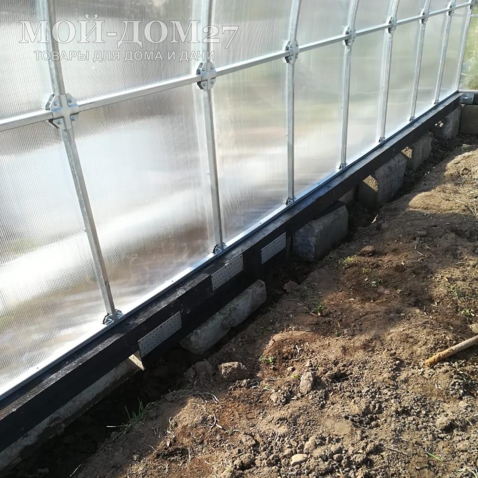 Монтаж (установка) на фундамент (землю) – по всему периметру основания теплицы идет оцинкованная труба 30х20 мм, через которую происходит крепление теплицы к фундаменту (основанию).