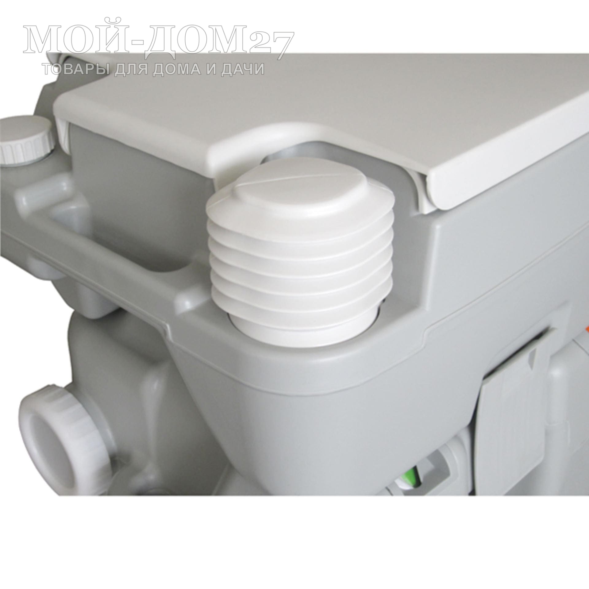 Биотуалет незаменим на даче. При сравнительно небольшом размере обладает приличным объемом нижнего бака. Слив в устройстве осуществляется при помощи сильфонной помпы, имеется клапан сброса давления.